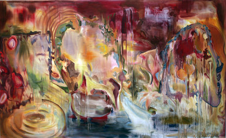 Fay Pritchard is fascinated by Japanese Buddhism and the interplay of light and shadow, a duality rooted in the ancient architecture and natural landscapes of her Japanese heritage. Working with diluted paint on light calico, she creates delicately layered compositions that embrace translucency, allowing natural light to filter through and engage with more defined, grounded forms. Warm hues set against airy cool tones evoke a sense of quiet mystery and tender nostalgia.