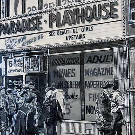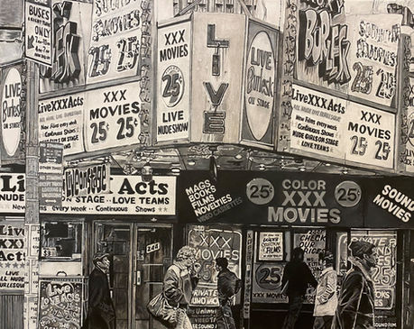 The work is about his perception of life when he was younger and the love and affection the artist had for everything New York City despite never going there. This perception of hope and a unique atmosphere influenced through film, television and music is observed through aged photographs in those eras but viewed in the present day with the objectivity of the real life situation back in time. Images of austerity and decay, grime, crime, graffiti, drugs and an excess in establishments offering adult entertainment, littered the streets of New York. Yet all Matthew saw was freedom, expressionism, hope and inspiration.